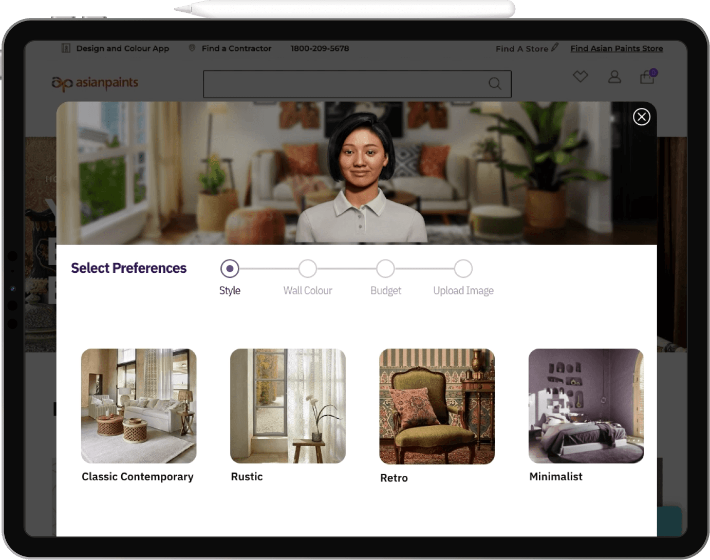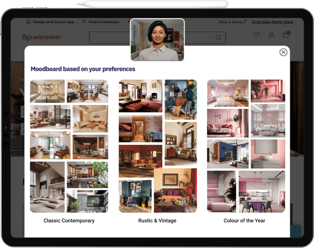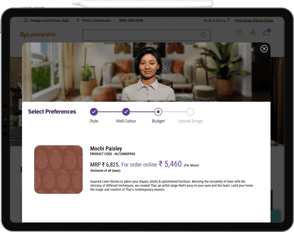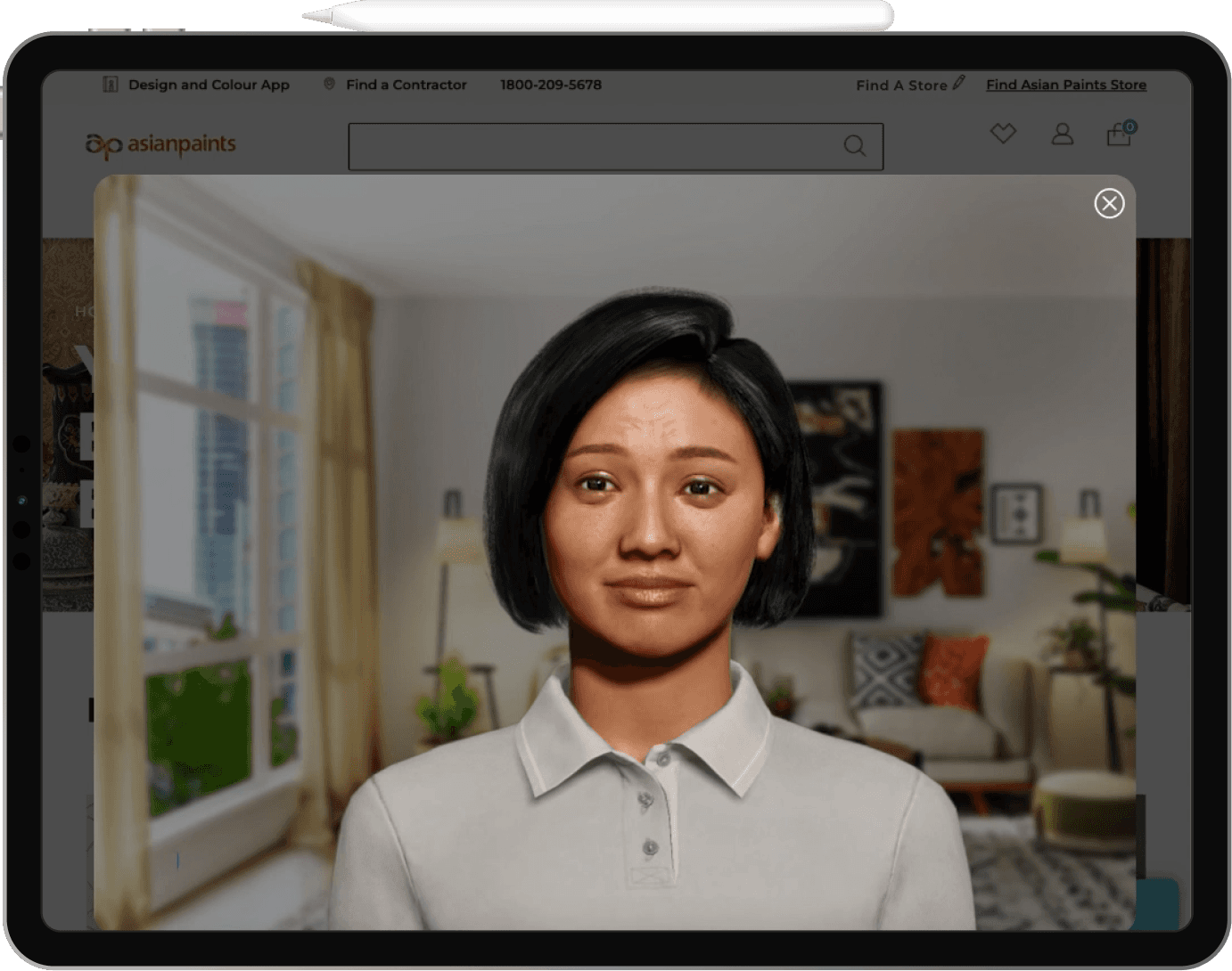 A pop-up interface was created for users to interact with a digital human assistant, acting as a sales rep, it guides users to suitable products, suggests color, texture, and material options, and helps with informed choices, store directions, and a seamless online-offline experience.