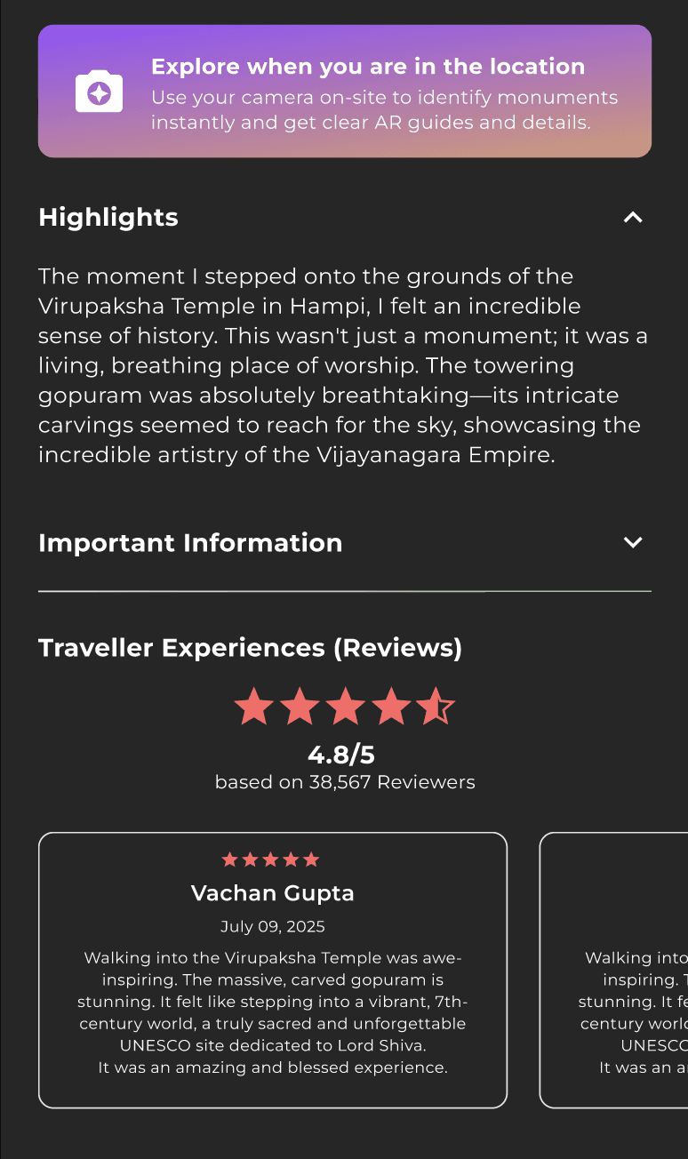 The AR camera shows instant information at locations. Clear icons, audio and language support help travellers understand places easily.
