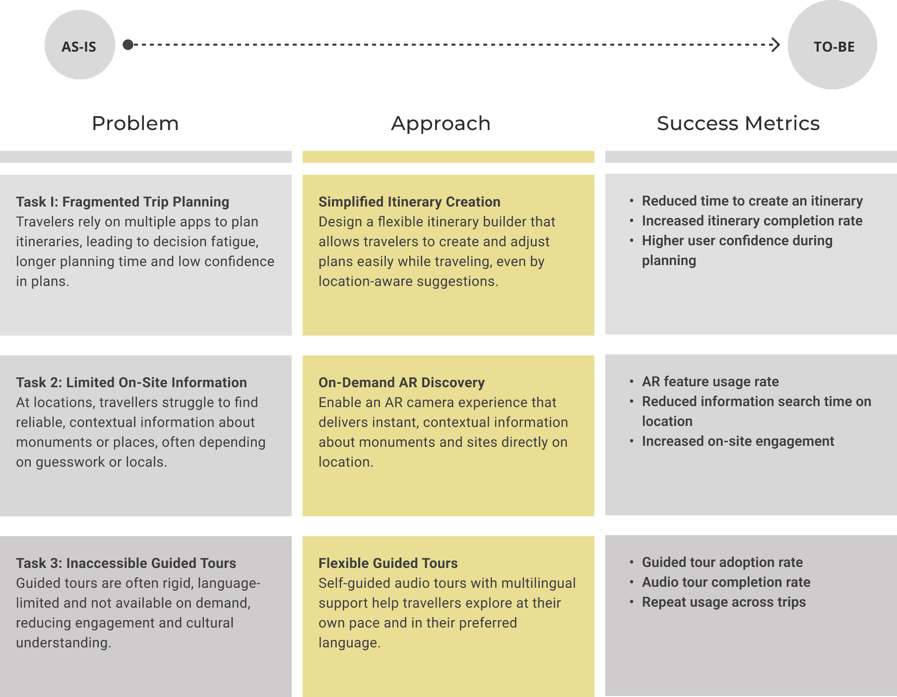 User interviews and secondary research helped us understand how travellers plan and explore trips, we found that planning feels scattered, information on location is hard to find and language barriers often reduce confidence while exploring.