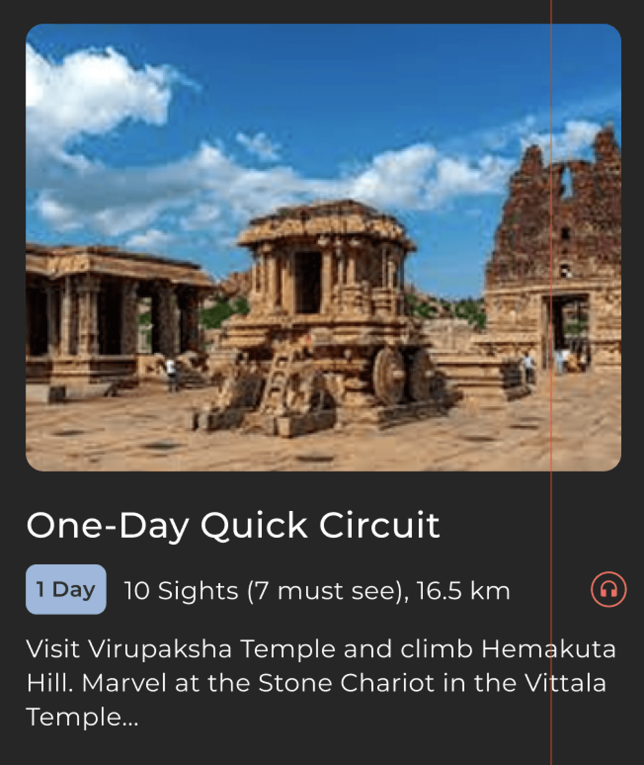 Tours are shown as simple cards with time and language details, audio previews and filters help users choose and explore at their own pace.