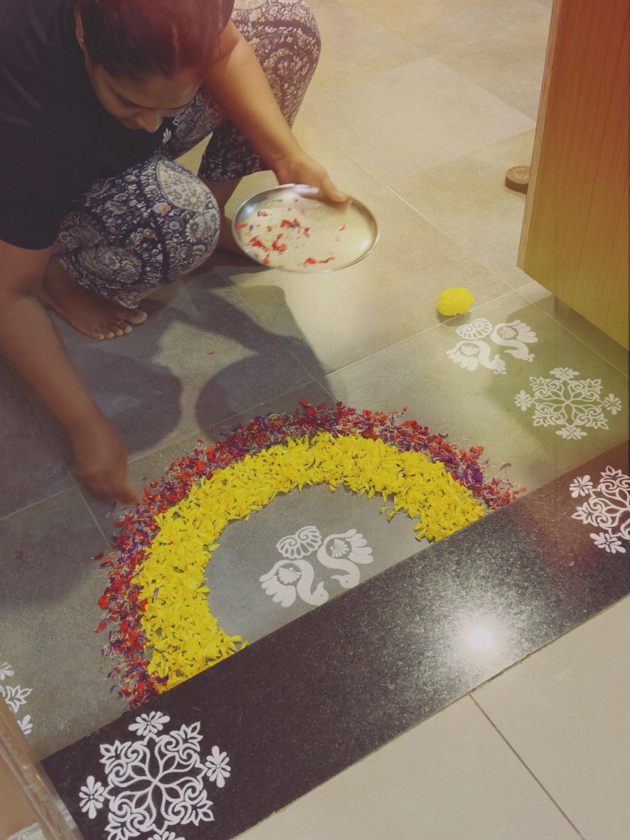 Bright flower petals of design to welcome the goddess of wealth into our home, celebrating with a rangoli and hearts full of gratitude.