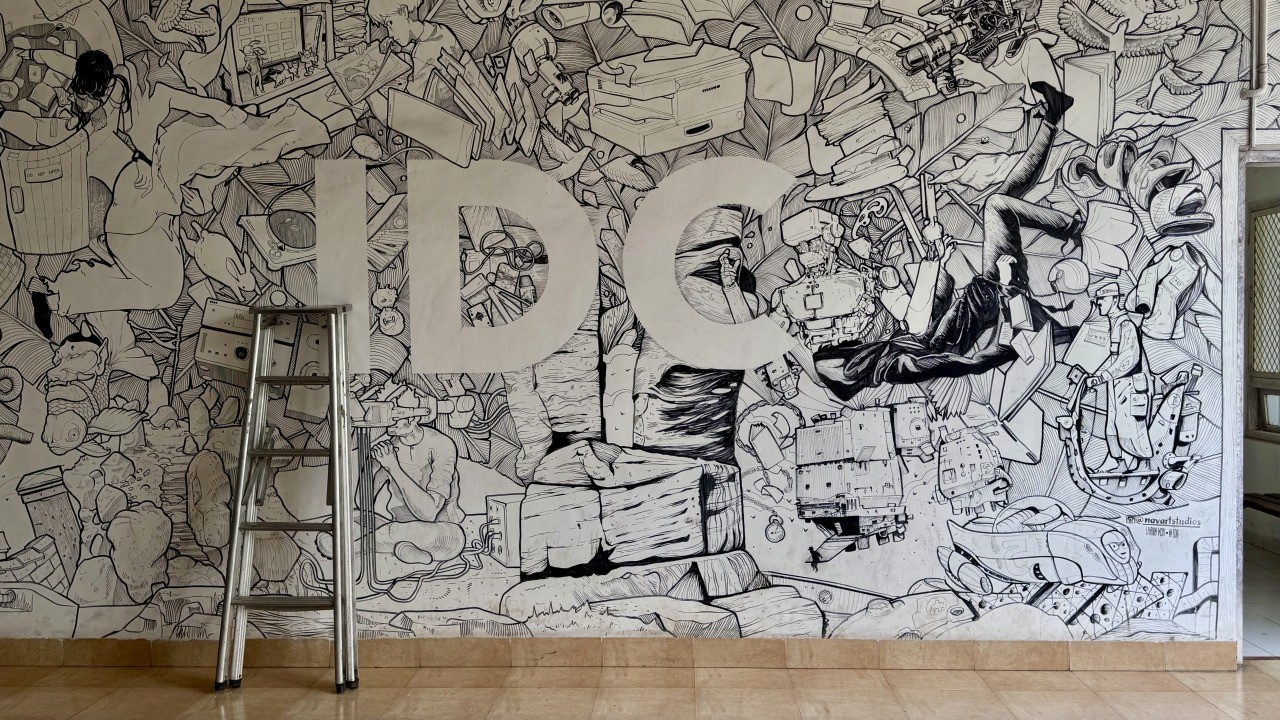 It feels like a living sketchbook at the IDC wall mural, with ideas, machines, people, and stories all flowing into one frame.