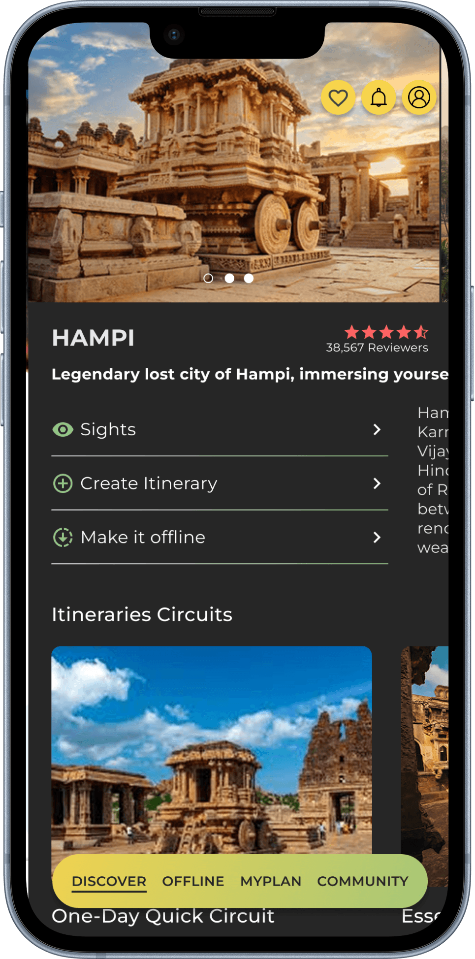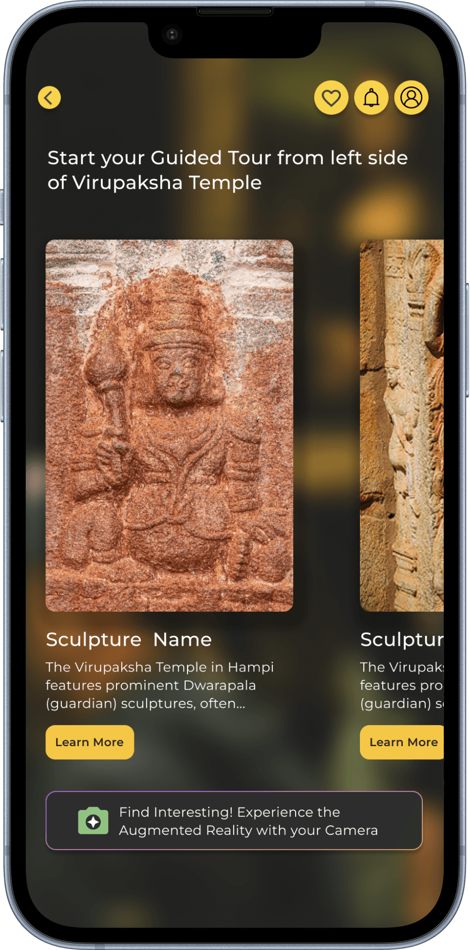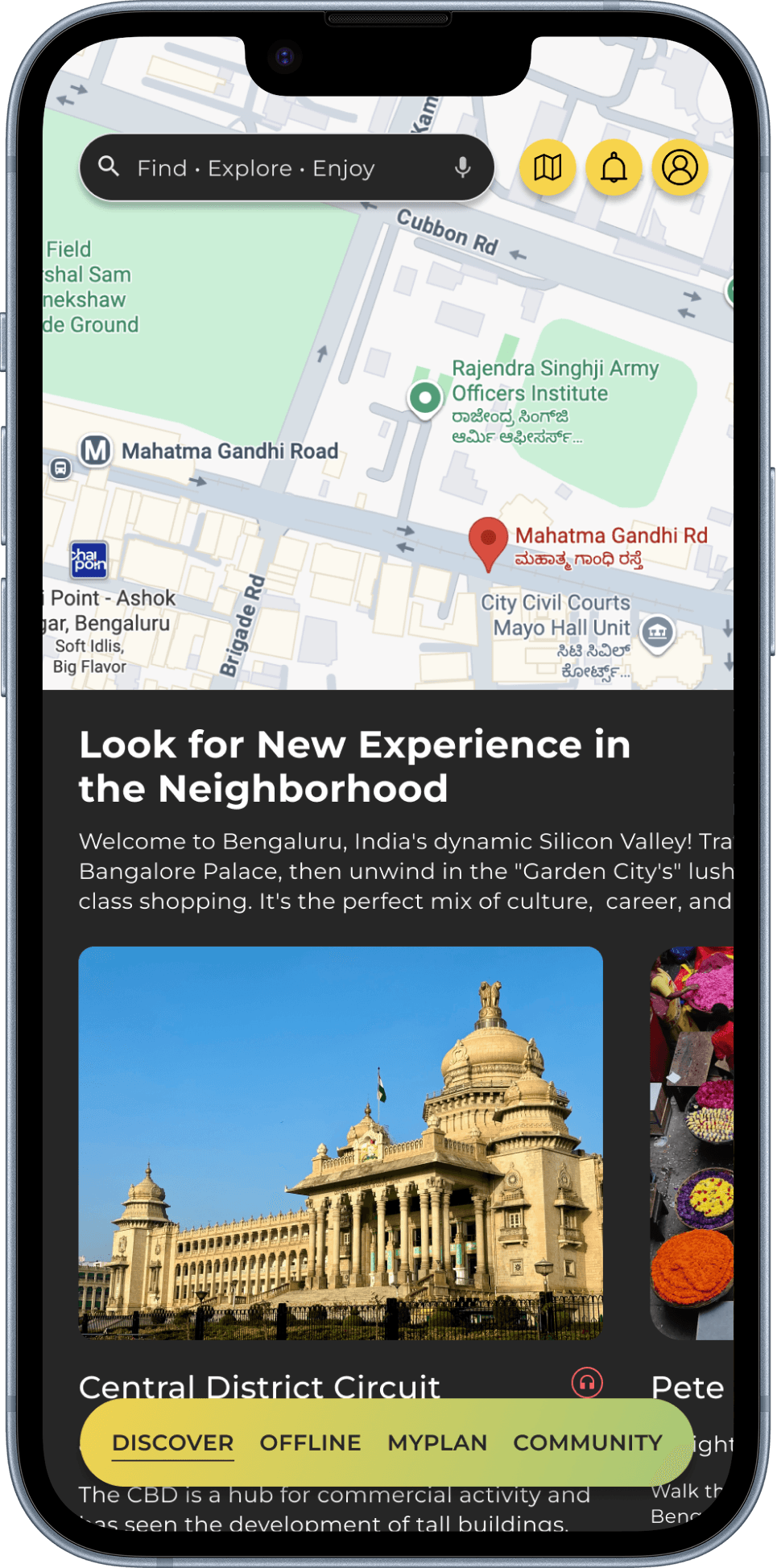 The AR camera shows instant information at locations. Clear icons, audio and language support help travellers understand places easily.